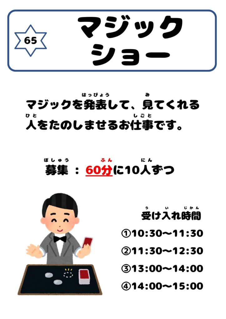 #65 マジックショー 投稿日: 2026年2月16日 投稿者: mayu タグ: サービス, 技術者 【関連するお仕事】 #10 出版社 #23 チッチェーノ映画館 #22 不動産屋 #64 回転ブランコ #06 Cber Eats #66 ダンスパフォーマー(ダンススクール) < お仕事一覧に戻る